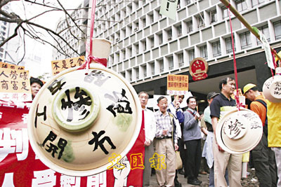 他們在立法會議員王國興、鄺志堅等帶領下,一行人在中環皇后像廣場行人道出發,先遊行到政府總部,其後約30名代表再遊行到禮賓府,遞交請願信。之後王國興等人又上演街頭劇,把吊起的砂煲打爛,他們解釋:「工人無糧出,無飯開,煮飯的砂煲都要吊起。若外判制度再這樣下去,工人只會繼續受害,砂煲不打爛都無用!」