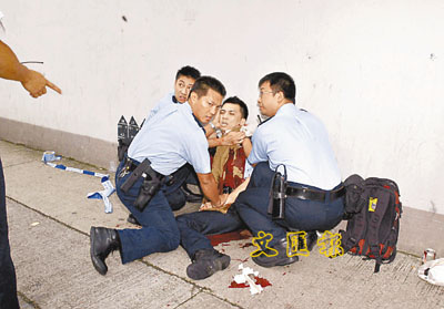 ■遇襲警員朱振國頸部動脈被割破,由同袍緊按傷口。 資料圖片