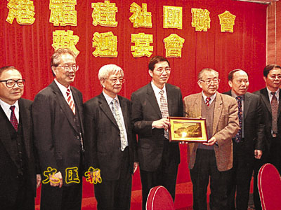 ■福建三明市市長張健(中)向香港福建社團聯會高層致送紀念品。