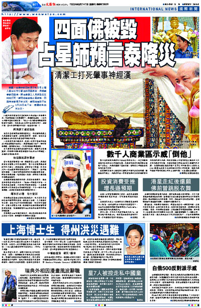 泰國一名精神病回教男子昨日早上潛入曼谷市中心著名的四面佛寺,用鐵鎚擊毀四面佛,兩名清潔工人見狀活生生將他打死。總理他信家庭占星師稱,四面佛被毀是不祥之兆,總理他信如不在3月29日前下台,泰國將有血光之災。