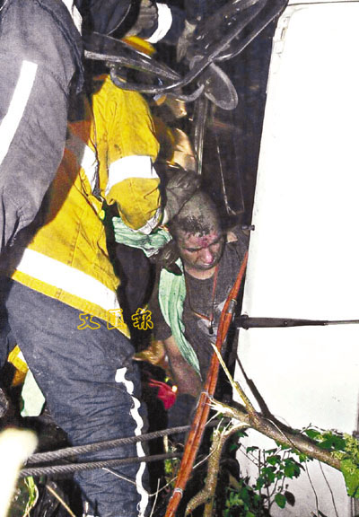 【本報訊】粉錦公路昨晨發生險死還生的驚險車禍。一輛由巴籍司機駕駛的輕型貨車失事翻下約4米山坡後,車頭著火焚燒,司機受傷被困,正當火勢蔓延至油箱即將發生爆炸之際,幸消防員及時趕到,一面開喉灌救,一面合力救出被困司機,司機被嚴重燒傷,送院後恐有性命之虞。