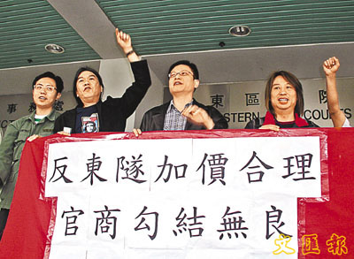 5名被告梁國雄、曾健成、陶君行、陳國樑及李德華被控於去年4月29日中午12時45分,以4輛車停泊在東隧入口,並拉起一幅約5.9米乘1米的橫額,以大聲公叫囂抗議東隧加價,並吸引記者採訪,令有30車輛被困在收費亭內,交通嚴重受阻達21分鐘,而車龍由東隧伸延至藍田地鐵站,估計受影響車輛多達數百輛。