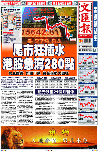 【本報訊】市場擔心加息周期繼續延長,拖累美、日等外圍股市下跌,港股昨日低開133點,報15,790點,午後期指大插水,拖累港股尾市半小時跌勢轉急,曾一度跌逾300點至15,600點邊緣。加上投資者憂慮今日公布的長和系業績較預期差,以及匯控(005)除淨等因素,恆指全日大跌279.94或1.76%,收市報15,642.81點,成交增至336.88億元。而內地「宏調令」下,國企指數亦急跌83點,報6,479點。