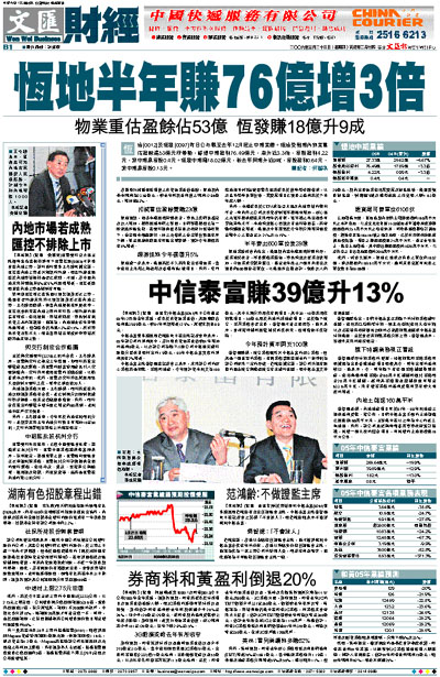 恆地(0012)及恆發(0097)昨日公布截至去年12月底止中期業績。恆地受到期內物業重估盈餘達53億元所帶動,錄得中期盈利76.49億元,急升近3.3倍,每股盈利4.22元,派中期息每股0.4元。恆發中期賺18.02億元,較去年同期升近9成,每股盈利0.64元,派中期息每股0.13元。