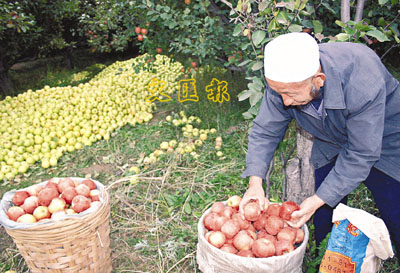 ■寧夏蘋果產區以吳忠市為中心,圖為回族果農喜收蘋果。 郎宏偉 攝