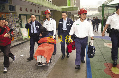 昨晨10時,上址單位又發出敲擊的聲音,吳即時顯得十分煩躁,有人突然取起一把尖菜刀及其他工具衝往樓上,並迅速拆去該單位門外的煤氣表,並在門外大吵大鬧:「最多大家一鑊熟」。黃姓37歲女戶主大驚,於是通知54歲姓張女保安員代為報警。