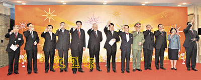 ■董建華、曾蔭權、高祀仁及呂新華等在酒會上,與一眾嘉賓一起舉杯,祝願香港繁榮穩定,港人身體健康。