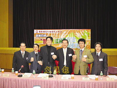 ■譚耀宗與各地代表介紹即將舉辦的「兩岸四地髮型化R競技比賽」活動內容。