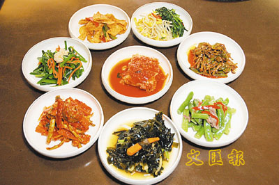 食客可先品嚐8小碟配菜,份量是因人數而定。包括泡菜、菠菜、豆芽菜及海帶等,當中以泡菜最受歡迎,除了味美外,全因韓國人每餐都要品嚐泡菜。(a)