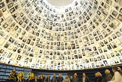 耶路撒冷的大屠殺紀念館頂部,貼滿受害猶太人的照片。 路透社