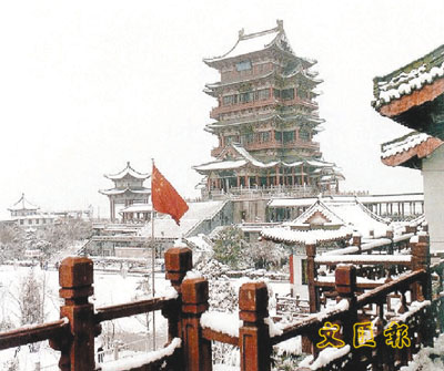 下午,滕王閣迎接我們的竟然是一張陽光笑臉。這座始建於公元六五三年,幾經重建重修,現整體面積比原閣要多三分之二的樓閣,歷來有「閣以文傳,文以閣名」之說,可以說是南昌一寶,享有「西江第一樓」之譽。因此,謁滕王閣也是我們來南昌的目的。尤其是那一句千古佳句「落霞與孤鶩齊飛,秋水共長天一色」更是熟誦於心。在這樣一個瑞雪初霽的春日午後,為踐一個詩意之約,我輕輕地移動腳步,拾階登閣,眼前彷彿有翩翩蝶影,是那位生於鐘鳴鼎食帝王家,卻被目為「驕縱逸游」「狎暱廝養」並因「數犯憲章」一再被貶的滕王彩筆所繪之蝶麼?據史書記載,李元嬰的確不是一位合格的官員,然而卻又是一位難得的丹青妙手。指責他最大的罪證無非是其兄唐太宗李世民發喪期間還召集僚屬宴飲歌舞,全然沒有哀惻之情。然而若以妻死鼓盆而歌的莊子人生觀論之,人之生命乃從無到有,又從有到無,順應自然之規律,李元嬰的做法又有何過錯呢?