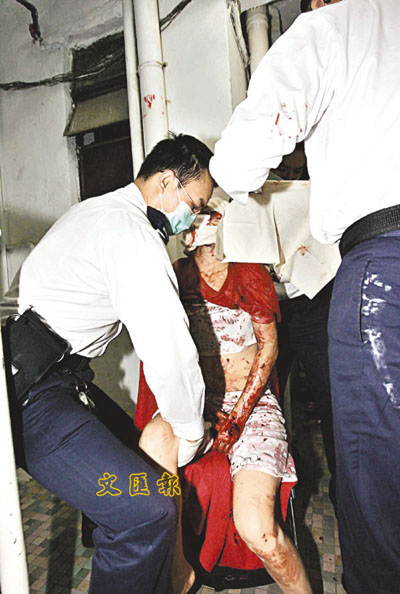 【本報訊】典型的老夫少妻式中港情緣血案昨晨再上演,一名失婚本港男子,與年齡相差35載的內地女子在深水步築愛巢僅3個月後,男子懷疑同居年輕女友另有新歡,昨晨雙方爭執,有鄰居聽聞女方說:「畀5千我就返上去……」之後即被人揮菜刀狂斬面部10多刀蓄意毀容,疑兇傷人後疑畏罪由8樓天台跳樓企圖自盡,卻因壓毀外牆簷篷及晾衣架卸去部分衝力,僅撞傷頭部,但與被斬傷女子送院急救後,情況俱嚴重。