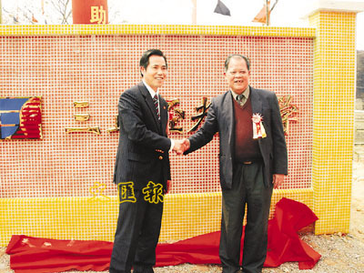 ■三正集團董事長兼總裁莫浩棠(左)和廣東省教育基金會副秘書長余潮波(右)為三正徑光小學新校名揭幕。