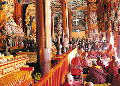 藏傳佛教,既崇拜山嶽冰川湖泊,又崇拜諸神。各種廟宇都有活佛,且「活佛」是由轉世靈童正續。藏傳佛教盛滿了佛陀輪迴的虛空飄緲,勾勒起藏民對佛的虔誠。藏民的情結就是對佛的頂禮膜拜,將最好的東西奉獻給佛。人要躲過輪迴的劫數,就要修煉成佛性,而成佛必須借助於自然神的感悟,也就是說忘卻自我,獻身於佛,這又是它回歸自然的一種文明。歷史釀就的滄桑,歲月集結的人物故事,就像生命的旅程一樣,誕生、成長、死亡,終究都回歸於自然。