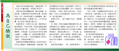「沒有,我唯一值得驕傲的是有班和我一起工作的同事,他們用個心去工作,從來沒有計較自己的得失,有時病人太多,他們提早上班,推遲下班,而且開設熱線。在我們這裡的病人,可以打電話回來問有關的問題,他們毫無怨言,我們是一個團隊,假日去辦講座全部免費,為的是宣傳健康的常識,特別是一些比較低下階層的社區,正是我們的服務對象,我為他們感到自豪。」