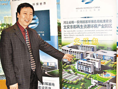 【本報駐河北記者王海軍29日電】在本次投洽會上,廊坊文安東都再生資源環保產業基地展區吸引了眾多參觀者的目光。該項目在廊坊(香港)項目推介會上曾被重點推介。文安東都再生資源環保產業基地管理有限公司董事長蘆曉民介紹,該基地總投資14億元,是河北省唯一通過國家環保總局批准建設的超大型再生資源環保產業園區。