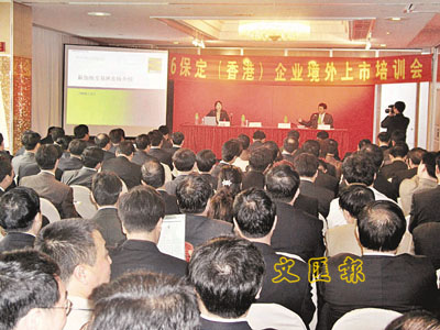 【本報駐河北記者梁利崢29日電】保定市在港舉辦了一場企業境外上市培訓會(見圖),新加坡交易所上市部副總裁林梅、香港志英集團總裁汪林佳、中銀國際投資公司王彤分別就新加坡證券交易市場、中國企業境外上市需要注意的問題等內容作了演講。保定市長于群、副市長高天民與百餘名企業管理者及縣(市)區政府領導一起參加了上市講座。