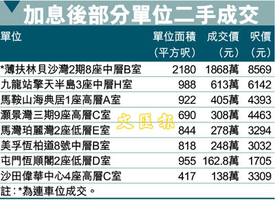 【本報訊】(記者 周穎)美國聯儲局宣布加息1/4厘,本港多家銀行亦跟隨加息,但由於加息消息市場已經消化,暫時未見影響二手物業的交投氣氛,昨日市場仍錄得多宗成交(詳見附表)。