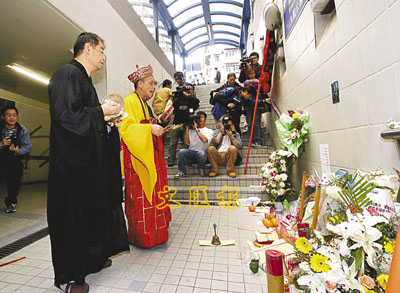 ■高僧在警員槍擊案現場舉行超度儀式,希望殉職勇警早登極樂。 本報記者溫瑞麟 攝