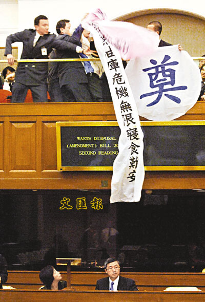 【本報訊】(記者 明言)立法會昨日審議廢物處置修訂條例草案,就醫療廢物的處理及運送作出管制,並在青衣設立化學廢物處理中心焚化醫療廢物。其間,有聲稱為「青衣居民代表」的市民突然在旁聽席展示橫額及高叫口號,反對將醫療廢物運往青衣焚化,擔心危害健康。