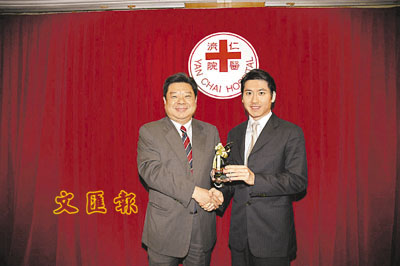 ■仁濟醫院董事局新任主席周德煒從鄧錦雄手中接過印鑑。