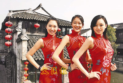 30日,來自北京賽區的三名「旅遊小姐」張雪、王伊娜和陳付媛(從左至右)在浙江西塘古鎮亮相。新華社