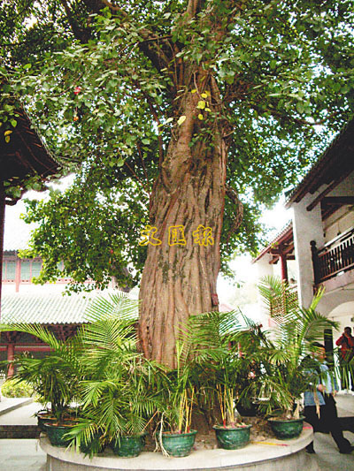 不少遊客都在問起菩提樹,原來南華寺內確有一棵真正的來自印度的菩提樹,此樹栽於內庭,已有二百多年樹齡,長得有二層樓那般高。枝葉遮天,灑下一地的綠蔭。當然,當年的惠能法師所示的佛偈,即那句「菩提本無樹」,是另一種目光所觀的實相外的「無相」了,但眼前的這棵菩提樹,卻委實長得極為喜人,都說它也蘸上了惠能的禪宗智慧,加上香客們的傳說,令此樹身價大增。但見許多遊客列隊以順時針方向繞樹而走一圈,據曰走後可變得聰明云云。有人更撿一片落於樹腳下的小葉珍藏,取名叫「聰明葉」,說帶回家給孩子作書籤,定有靈驗—這是一種美好的祝願和遐思,也很有詩意。