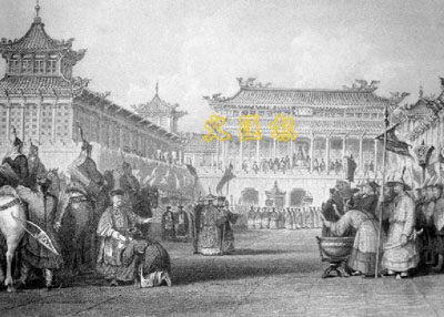 受俘禮的程式是:威嚴依仗中,皇帝在文武百官簇擁下升座午門樓。出征主將押解被俘頭目,面向皇帝拜俯於地。兵部尚書跪奏平定某地俘囚某等,謹獻闕下。皇帝降旨:「所獻俘交刑部。」刑部尚書跪下領旨,兵部官員引俘虜出,交與刑部官員。刑部官員押著俘虜離去,逐一發落。受俘典禮結束。 (上海 茂清)