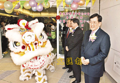 ■周一嶽(右)昨出席港大中醫臨床教研中心揭幕典禮,欣賞舞獅助興。 本報記者劉國權 攝