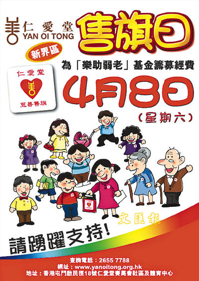 同時,仁愛堂亦獲批准於新界區的地鐵、西鐵、火車及馬鐵站內及外和公共街道,設立35個售旗站,盼社會各界踴躍支持,慷慨解囊。樂助弱老仁愛堂於本年度新成立之「樂助弱老」基金,主要為自理能力較差、體弱但又未符合入住政府資助院舍的長者,提供一系列到戶家居支援服務,例如家居清潔及維修、陪診護送、看顧服務、家用物品轉贈等服務,在改善體弱長者生活質素的同時,亦可紓減家人照顧體弱長者所承受的壓力。