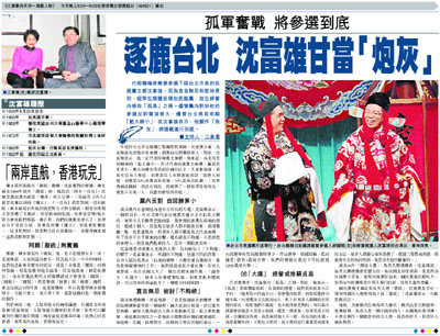 已經積極表態要參選下屆台北市長的民進黨立委沈富雄,因為直言無忌和堅持原則,經常在媒體前痛批民進黨,故在綠營內部有「孤鳥」之稱。儘管黨內對於他的參選反對聲浪很大,儘管台北格局明顯「藍大綠小」,但沈富雄表示,他願作「炮灰」,將選戰進行到底。