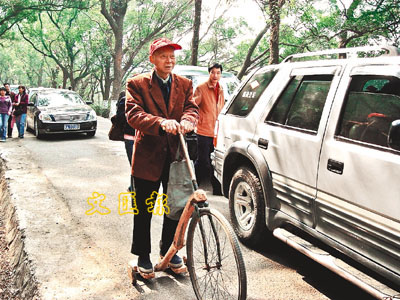 日前,記者在去福州鼓山風景區的路上看到一位騎著怪車的老漢。老漢姓陳,今年70多歲,喜歡自己動手製作東西,這輛怪車就是利用廢棄的自行車加上幾根木棍做成的。本報特約記者林小宇 攝