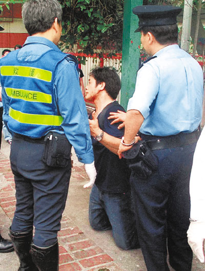■涉嫌打傷人的男子,跪地向警員表示自己才是受害人。