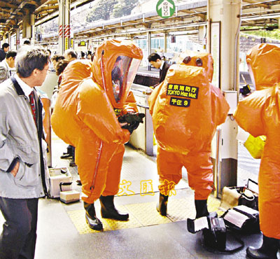 ■東京火車站,消防員穿特別隔離衣調查現場。美聯社