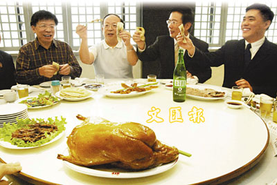 ■民進黨籍沈富雄(左起)、國民黨籍蔣孝嚴、蔡正元及郝龍斌等幾位台北市長參選人本月1日共聚一堂,大啖烤鴨。