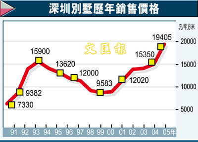 【本報訊】(記者 吳文爾)中原一份有關深圳豪宅的投資分析報告指出,雖然宏調對於豪宅市場加於嚴控,但其發展勢頭仍然強勁,長久以來深圳傳統空中豪宅的均價為每平方米9000至10000元,而別墅均價則在13000元徘徊,去年別墅平均銷售價格上升26%,至每平方米19405元,相信在供不應求的情況下,今年的價格仍會往上攀升。