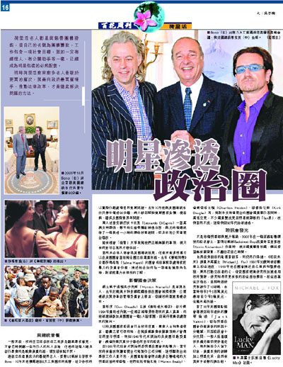 遊說立法者最成功的藝能界名人,要數U2樂隊主音歌手Bono,10年來他積極遊說8大工業國政府高層,迫令各政府以實際行動處理世界貧窮問題。去年10月他跟美國總統布什共晉午餐達90分鐘,兩人談到解除貧窮國家負債、愛滋病、瘧疾及國際貿易等問題。