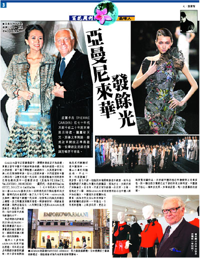 CARDIN當年正值事業盛年,選擇來華肯定不為商機,事實上當年中國不可能有時裝商機,總的來說是一回文化大使旅程,留下種子帶動國人認識西方,尤其是當年獨一無二的巴黎精緻時裝。從以上因素來看,卡丹是值得中國人懷念的。亞曼尼也是一代宗師,亦是啟動意大利時裝與巴黎抗衡的其中一位重要功臣(其他為VERSACE, VALENTINO, MOSCHINO……屬同代,稍後有PRADA, GUCCI, DOLCE & GABBANA……)七十年代末八十年代初一套ARMANI套裝尤如一份與現代流行精品藝術的交融,富時代的衣著流派。過了九十年代中旬,ARMANI風光無兩,儼然富可敵國一代宗師;但險峰上的風光再難往上調整,反之明顯見到漸次滑落。時裝做得好,與創意是兩回事;我們在過去七、八年間已甚少見到ARMANI出現新意念,產品是一流的,但已在保守及高年齡層的水平。