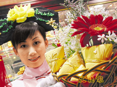 9日,一款「金粽子」在濟南齊魯金店上市。它採用千足金電鑄成型,上面鐫刻有「五穀豐登」四字,分10克、20克、30克三種規格。圖為濟南齊魯金店的工作人員展示「金粽子」。 新華社