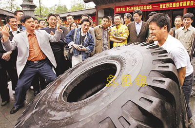 9日,浙江杭州舉行一項「推車胎比賽」,參賽者要推動一個重350公斤,直徑2.2米的車胎,滾動轉數最多者便可勝出。圖為一名參賽者使勁舉起車胎。 路透社