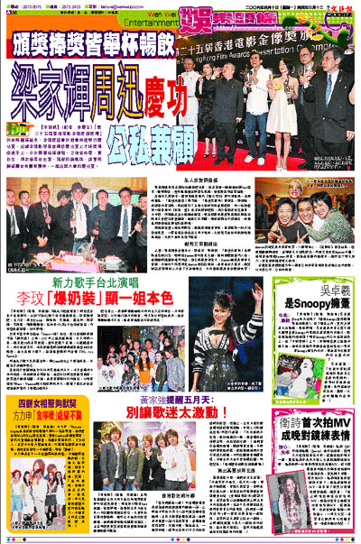 梁家輝演完舞台劇匆匆趕到慶功宴,捧著獎項一臉風騷地跟fans握手,雖很興奮,但可能因演出前沒吃東西,等候賽果時就胃抽筋。