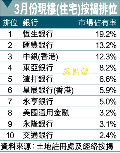 【本報訊】(記者 周穎)銀行息口按揭激烈,各銀行在按揭計劃各出奇謀,令3月份中各大銀行按揭市場佔有率出現顯著變化,於現樓住宅按揭市場中,繼二月份東亞銀行進佔首位後,三月份則由恆生銀行居榜首,佔有率更高達19.2%。