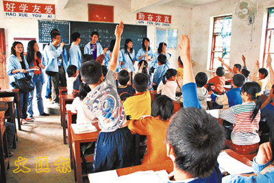 【本報記者曾媚、珠三角新聞中心記者羅陽廣州電】「未來之星—珠三角專業發展考察團」展開第2天的行程,100名本港大學生從繁榮的廣州,轉往貧困山區探訪3所學校。學員們與當地小朋友一起聽課、座談,並給他們送上自帶的小禮物。有些學生更嘗試執起教鞭,在簡陋的課室向小學生上了一節生動的英文課。學員稱,探訪令他們發現廣東省貧困地區急需外界幫助及自力更生。
