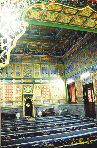 ■大清真寺禮拜殿內天棚藻井上繪有構圖各異的600餘幅彩畫,板壁雕畫,蔓草花紋中套刻《古蘭經》文。