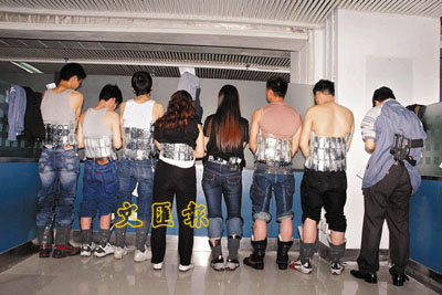 ■被截獲的8名「水客」,腰間和小腿綁滿了私貨。
