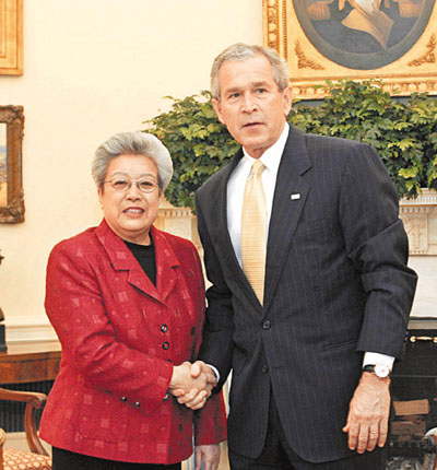 ■布什在華盛頓白宮會見到訪的吳儀。新華社
