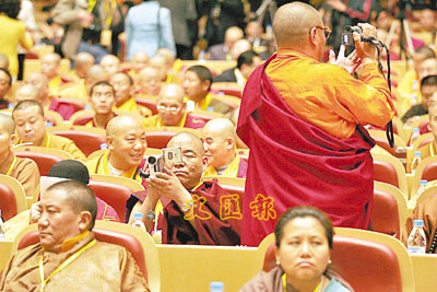 ■不少高僧在論壇盛會上用先進的數碼攝影器材拍照。 中新社
