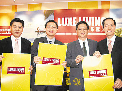 ■長實劉啟文(右二)、郭子威(左二)於東涌映灣園映灣坊售樓處內與利嘉閣廖偉強(右一)及陳大偉推介復活節優惠。 本報記者梁悅琴 攝