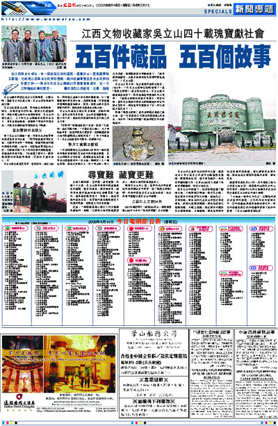 「文物是一個時代的化石,它凝結和反映著當時的經濟、文化和科技的發展水平,它的價值是其他事物無法替代的,而我的價值也因它們的價值而得到了最好的實現。」吳立山這樣告訴記者。