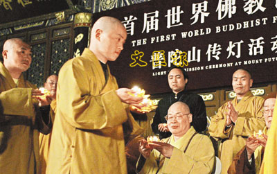 首屆世界佛教論壇15日中午由杭州移師浙江普陀山,來自世界40多個國家和地區的數千名高僧大德由車而船,由船而車,兼程趕往中國著名佛教勝地,繼續論壇活動。當晚,本屆論壇主要活動之一,「無盡心燈夜夜明」傳燈祈願法會在普濟禪寺舉行。